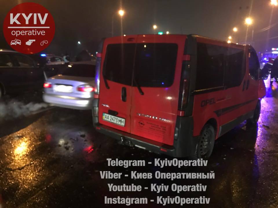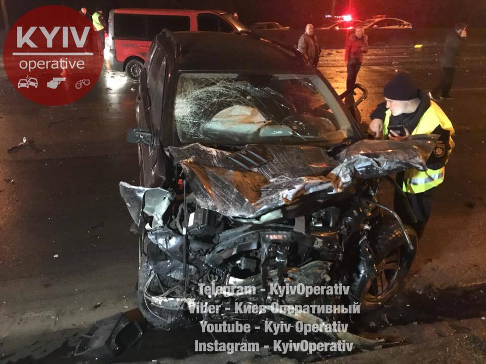 "Сегодня, приблизительно в 00:00, на проспекте Шухевича, сразу за Московским мостом (в сторону Троещины) произошла серьёзная авария. По предварительной информации, водитель автомобиля Mercedes, номер AA5956PH, выехал на проспект Шухевича против движения. Это увидели инспектора патрульной полиции и начали за ним погоню. Проехав несколько сотен метров, водитель Mercedes на огромной скорости въехал "лоб в лоб" в Dacia, которого через отбойник выбросило на встречную.